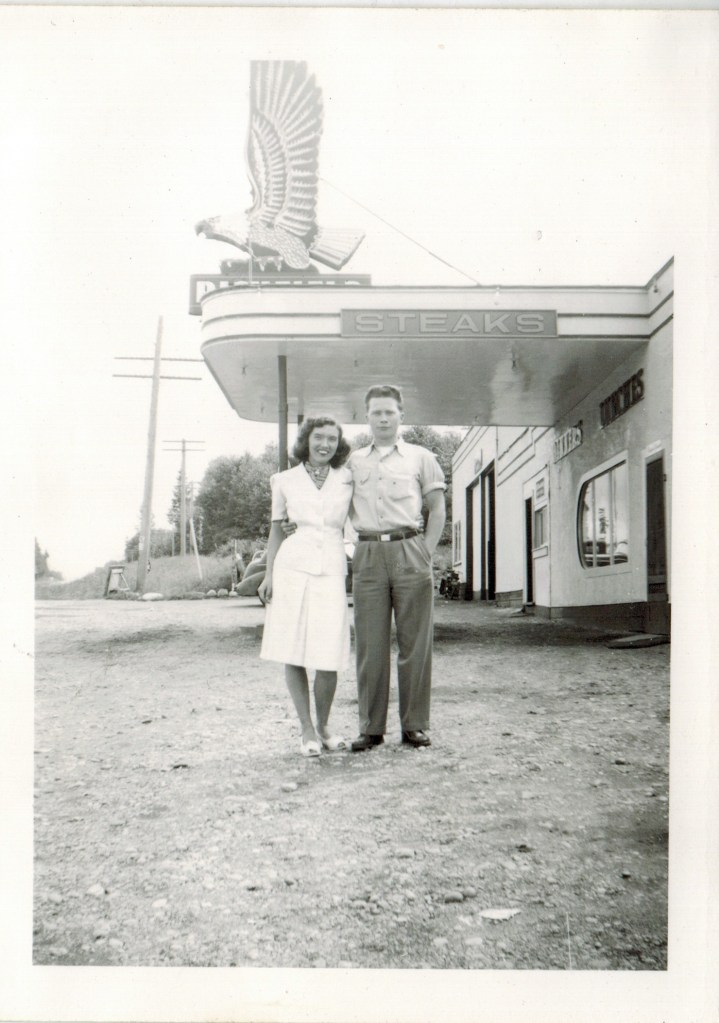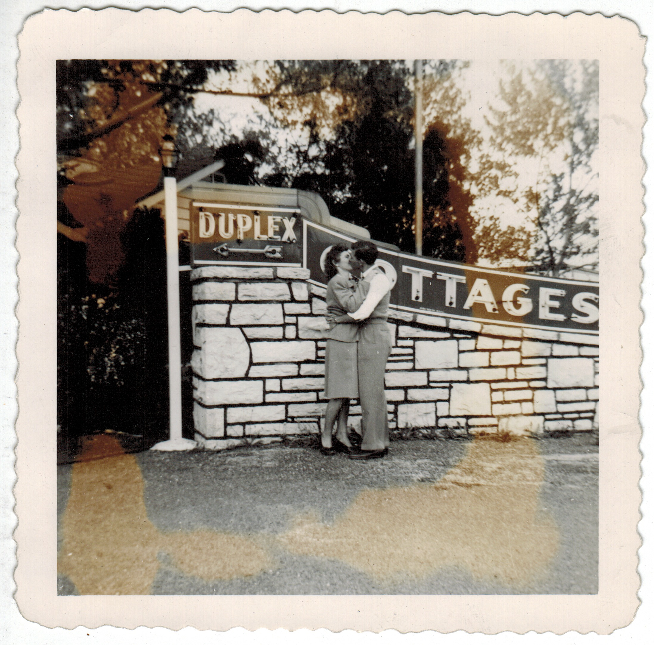 The couple at right are locked in an intimate embrace in front of a neon sign indicating they’re at a motel — for the night! This is not just a date, it’s an elopement or a wedding. And they’re celebrating that at a roadside motel, perhaps as part of a road-trip honeymoon to visit important American landmarks. The photo, taken with the neon sign as symbol of what happened that night, will fix this trip in their past, as well as in their future.