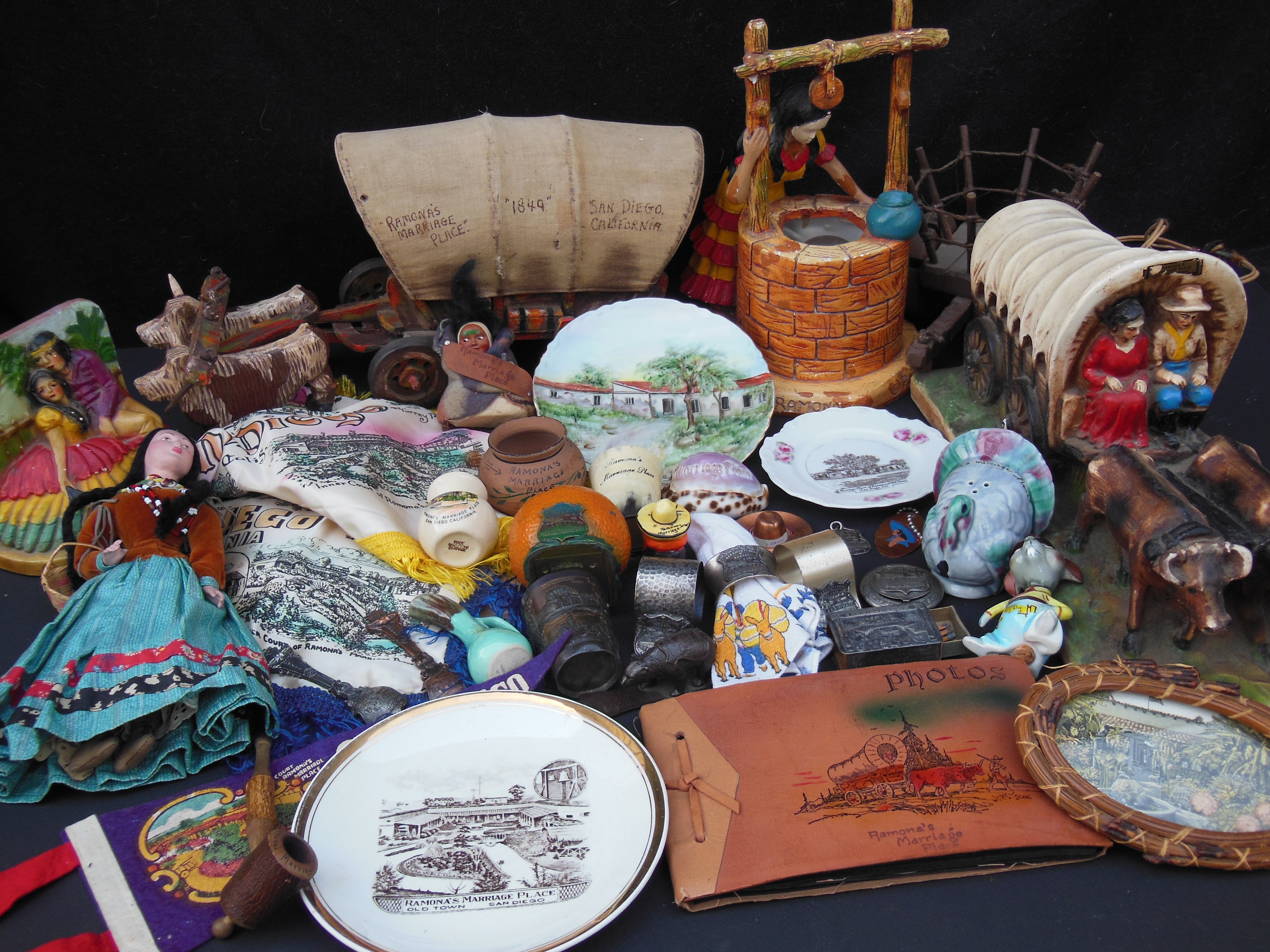 Below, the “curio shop” at Ramona’s Marriage Place sold an unimaginable array of souvenirs. The photo shows a small fraction of my collection, and I’m still buying more anytime I can find them. Many are joyfully ridiculous, as souvenirs often are.