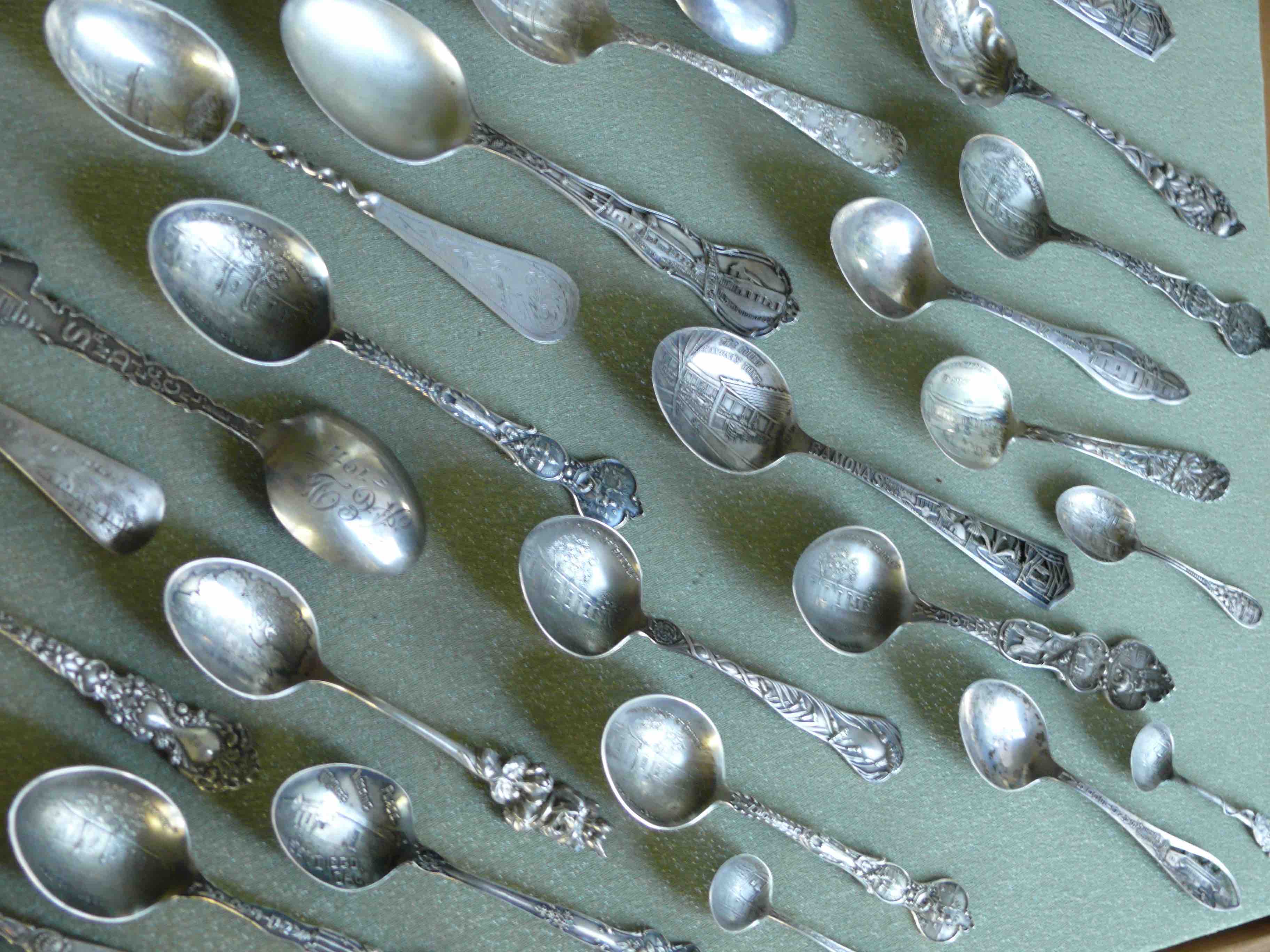 At left, a small portion of my collection of ornate sterling silver souvenir teaspoons, all related to “Ramona’s Marriage Place,” one of the most popular tourist attractions in southern California in the early-twentieth century. All are different, and some are personalized with dates and initials, commemorating a journey to a place made familiar in fiction, and made real in the landscape.